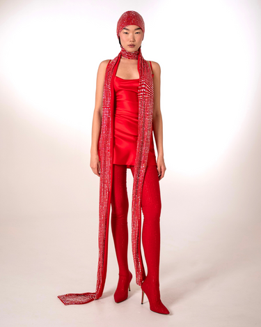 Crafted from 98% silk with a lustrous satin finish, the dress skims the body with effortless elegance, while its striking red hue commands attention. Styled with an ultra-long embellished scarf for added drama, this look is designed to captivate from every angle.