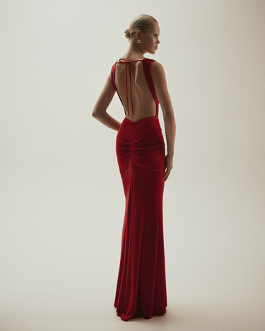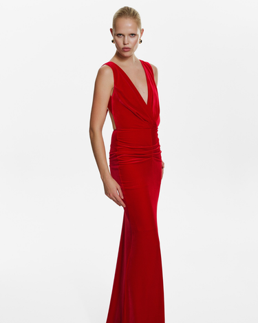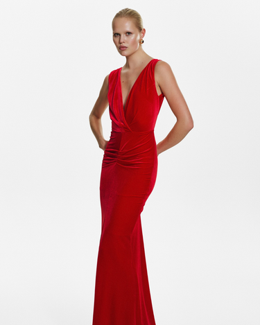 The long red velvet dress is a spectacular choice for memorable appearances. The fitted cut with drapes and ruffles highlights the silhouette, while the deep neckline and cut-out back add a sensual air. The rich texture of the velvet and the floor-length length give a dramatic and elegant effect.