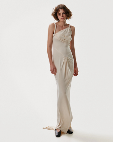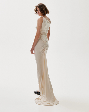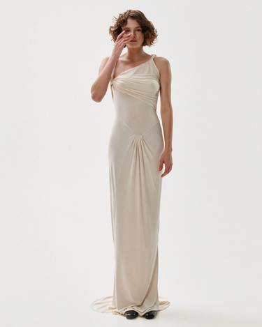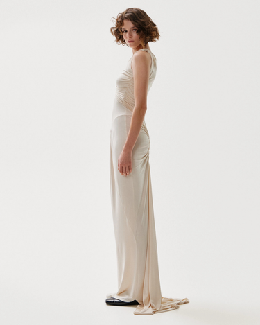 The milky white twist detail t-shirt maxi dress is a fluid and sophisticated piece, defined by a twist detail at the bust and an asymmetrical cut. The soft and stretchy texture delicately highlights the silhouette, and the fishtail train adds elegance and movement. An ideal choice for minimalist outfits with visual impact.