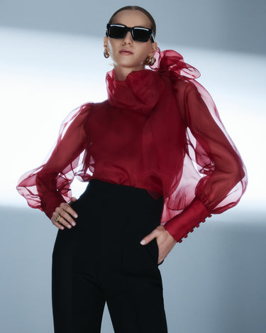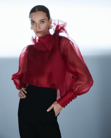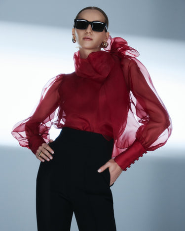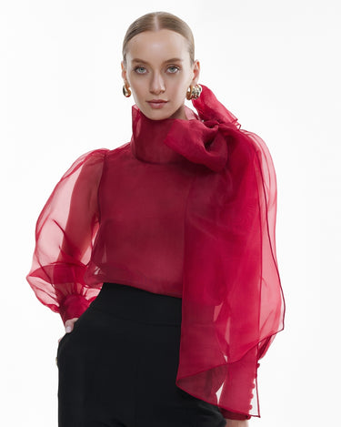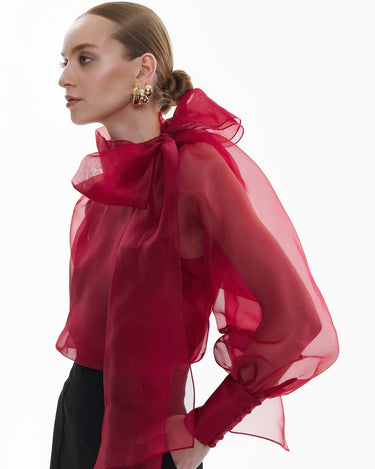 • Angelic yet playful, this flattering blouse is crafted from fine silk organza with a scarf tie-neck that can be styled to the front or nape of the neck in a plethora of ways.