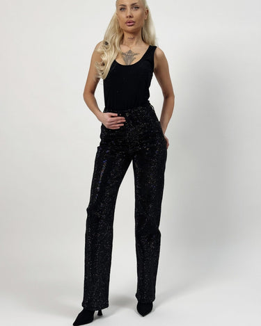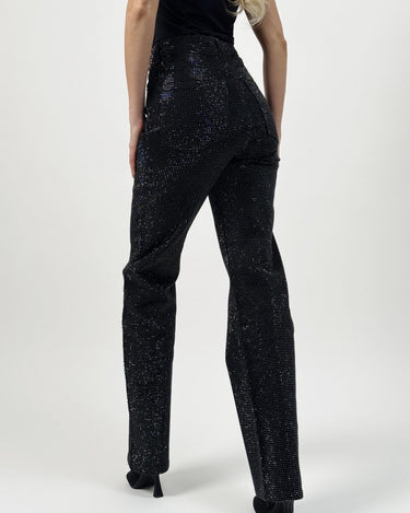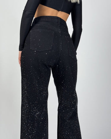 The black rhinestone straight jeans are perfect for a sophisticated yet relaxed look. Their versatile design makes them easy to integrate into various styles, from casual to elegant. The classic straight cut offers a balanced silhouette, and the rhinestone details add a touch of refinement and style. These are ideal for women who want to combine comfort with a modern and elegant look.