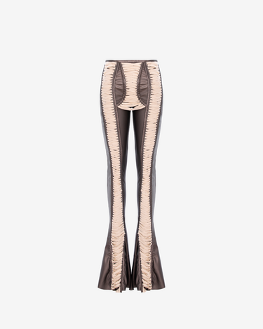 Flared trousers with decorative stitching bring a bold mix of rock aesthetics and western influences. The fitted silhouette is highlighted by contrasting panels of stretch material, which visually lengthen the legs and add texture. A statement look with attitude.