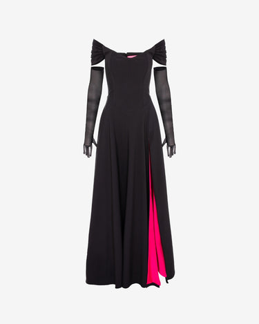 The timeless sparkle black evening gown with gloves is a piece of clothing that combines classic elegance with modern and sparkling details. This long evening dress stands out with its bare shoulders, corset design with whales and A-line skirt with a slit on the leg, offering a feminine and sophisticated silhouette. The gloves accessorized with RF crystals add a touch of glamour and exclusivity. The V-neckline and contrasting pink lining complete the refined look.