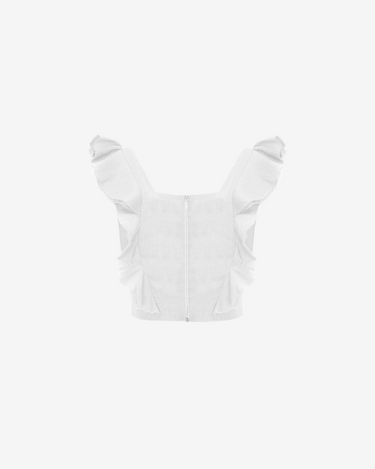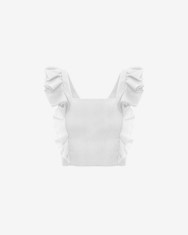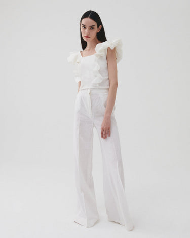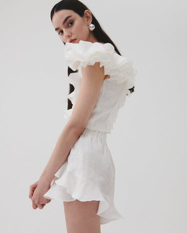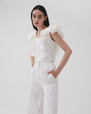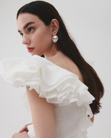 • It is crafted from luxuriously linen with a rich structure that accents the flamboyantly feminine ruffled shoulders