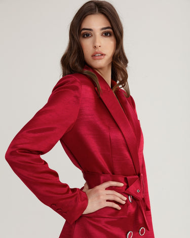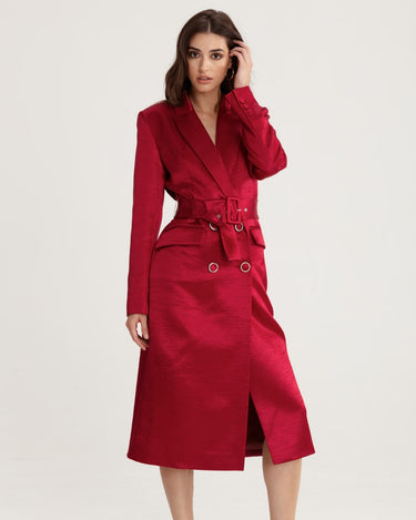 The Satin Midi Trench Coat, Red, is a versatile piece of clothing, crafted from a satin blend. Its design includes long sleeves, a front closure with silver buttons, a drawstring waist and two flap pockets, offering an elegant and functional look. The satin material lends a sophisticated touch, making it ideal for various occasions.