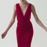 The long red velvet dress is a spectacular choice for memorable appearances. The fitted cut with drapes and ruffles highlights the silhouette, while the deep neckline and cut-out back add a sensual air. The rich texture of the velvet and the floor-length length give a dramatic and elegant effect.