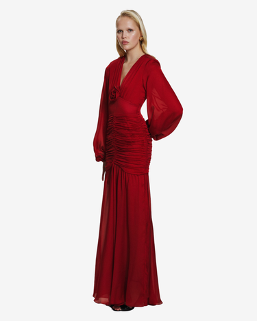 The long dress with pleated details, red is a spectacular piece, perfectly combining classic elegance with modern and feminine accents. Made of fluid and transparent silk, it highlights the silhouette with fine gathers in the hip area and a marked waist. The ample sleeves and deep neckline, complemented by a detachable rosette, add drama and refinement.