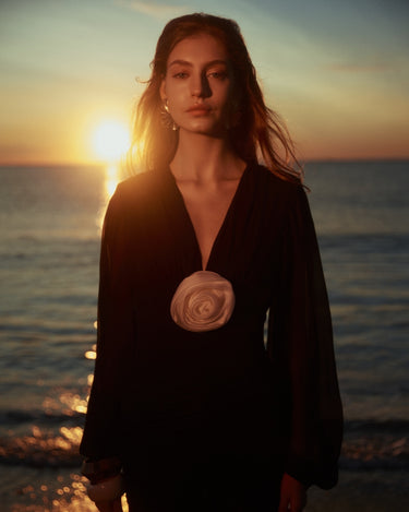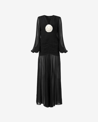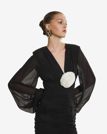 The Long Dress with Pleated Details, black, is a timeless elegance piece, perfect for special events. Made of sheer black silk, the dress highlights the silhouette with fine pleated details at the hips, voluminous sleeves and a tight waist, creating a remarkable contrast. This dress combines refinement and charm, ensuring an unforgettable look.