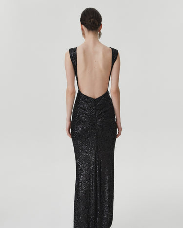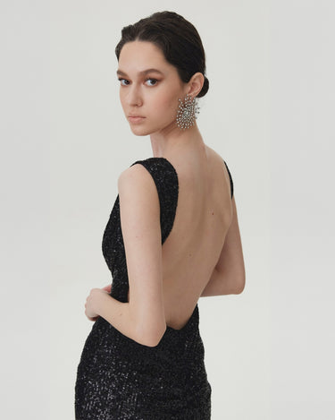• Crafted from translucent black sequins with a plunging V-neck which extends to an alluring scooped V-back, fitted with a structured bodice, fluidly flowing floor-lenght.