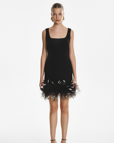 The black feather crepe mini dress is a playful and sophisticated reinterpretation of the classic little black dress. Made from double crepe for a smooth and structured effect, it has an A-line cut that highlights the waist and offers lightness. The hem decorated with ostrich feathers adds a glam and dynamic touch, perfect for evening outfits with personality.