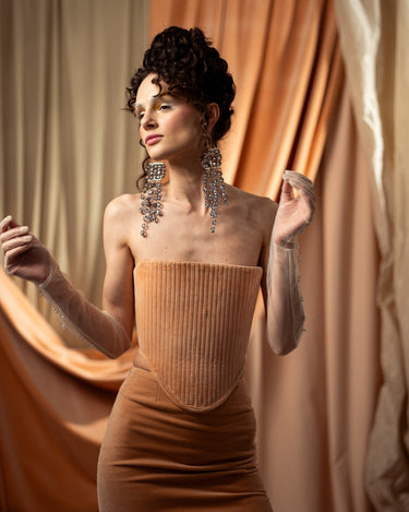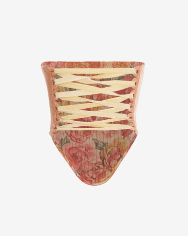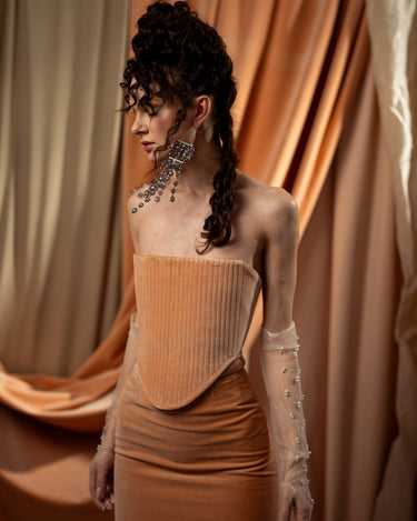 • Limited edition velvet corset with a side of peach fuzz velvet and one of pink dusted roses print on tafta.