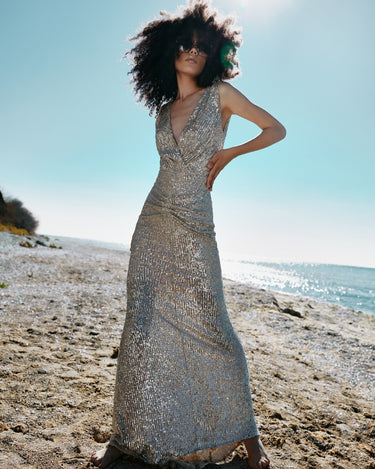 • Crafted from translucent black sequins with a plunging V-neck which extends to an alluring scooped V-back, fitted with a structured bodice, fluidly flowing floor-lenght.