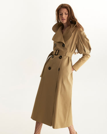 The Pleated Shoulder Trench Coat, Beige, is a modern reinterpretation of the British cut, standing out with its distinctive pleated shoulders. With double closure, drawstring and generous lapels, it is perfect for a timeless wardrobe. Ideal to be worn over an elegant dress or a classic suit, it offers an elegant vintage look.
