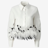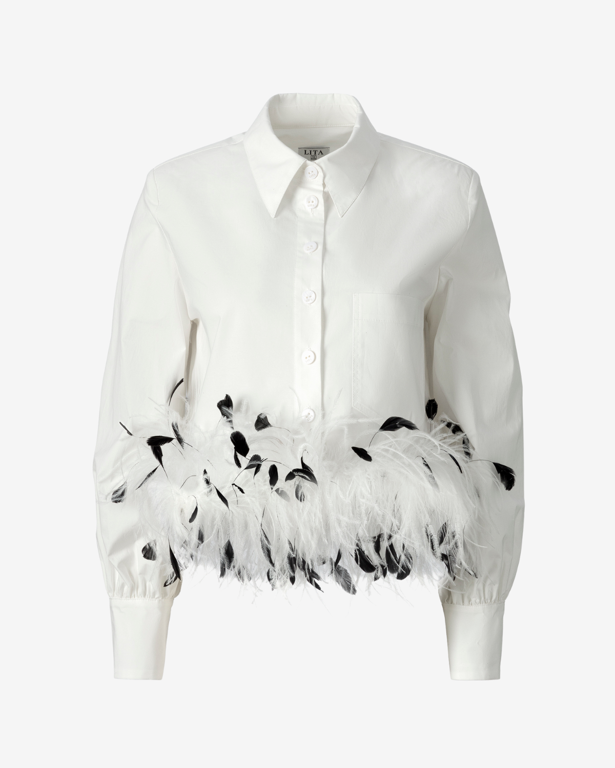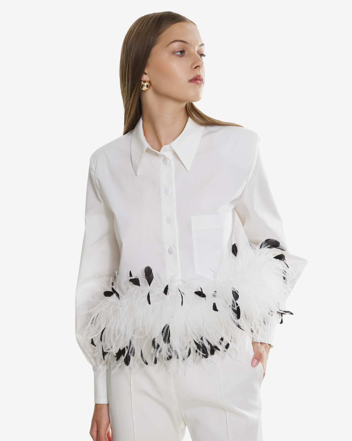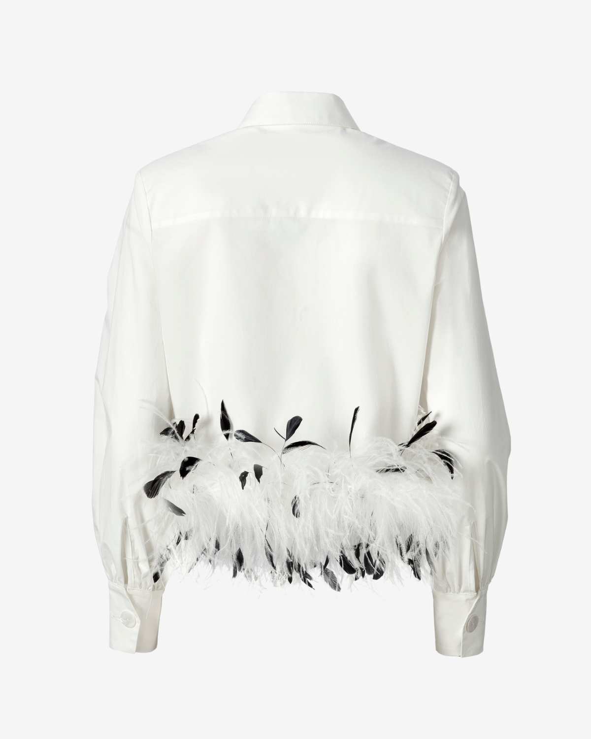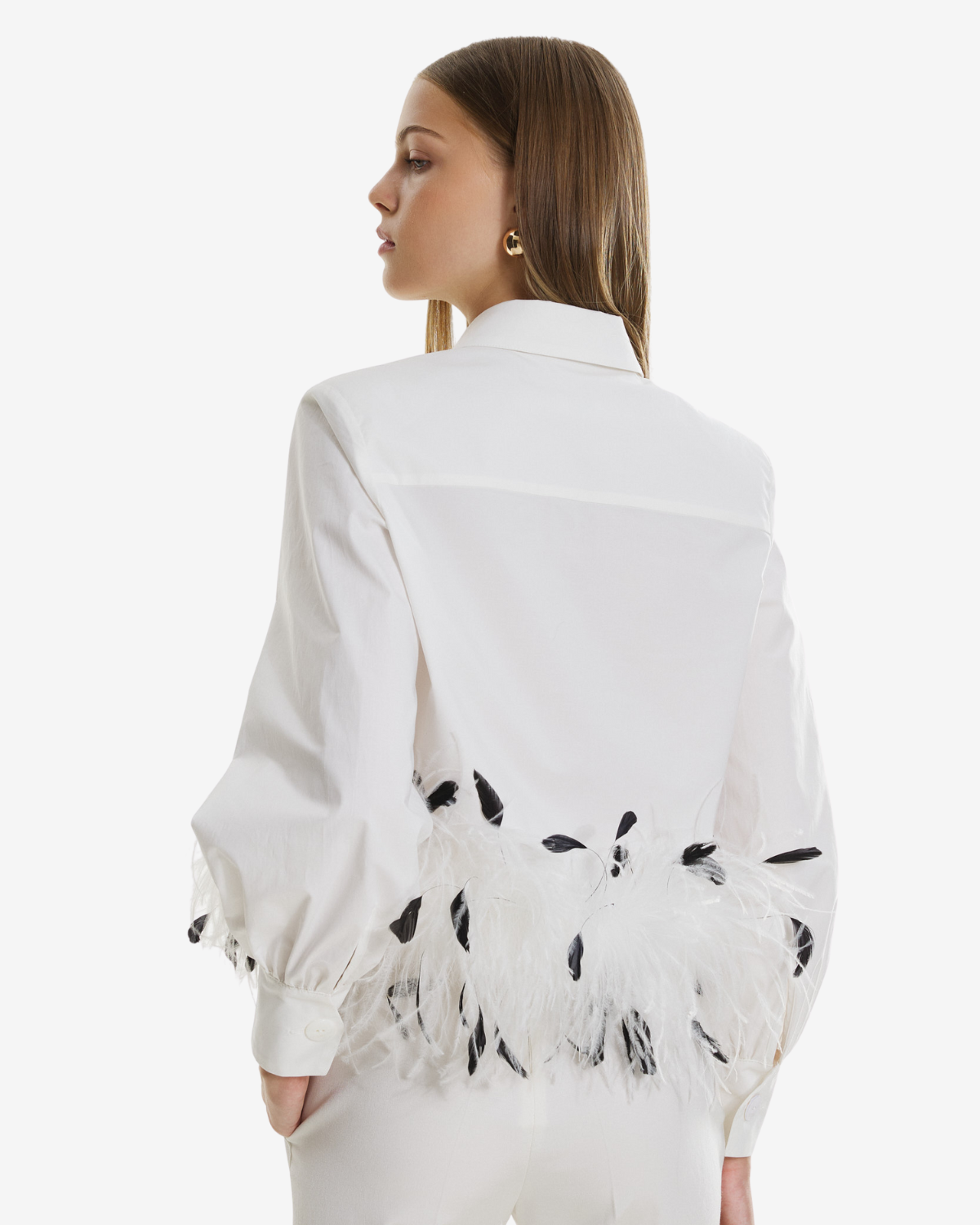 Detaliile fac diferenta, iar penele aplicate la tiv transforma camasa intr-o piesa spectaculoasa, cu estetica fashion-forward si vibe editorial. Epoleții structurati si mansetele cu nasturi echilibreaza proportiile, oferind un look puternic, rafinat si perfect pentru evenimente, seri in oras sau tinute cu atitudine.