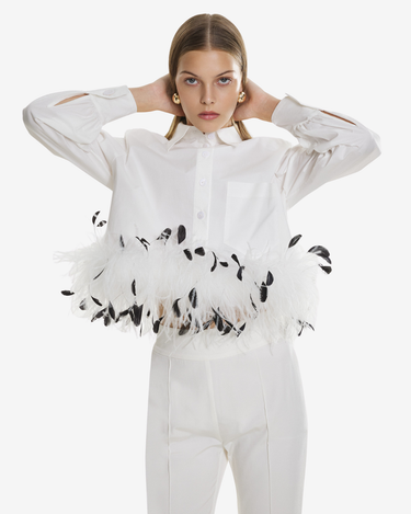 Camasa Crop cu Pene, Alba este o reinterpretare moderna a camasii clasice din poplin, cu linii boxy si croi scurt. Materialul crisp si gulerul cambrat pastreaza aerul traditional al unei camasi albe, in timp ce tivul decupat aduce un contrast fresh si contemporan. Este o piesa statement menita sa iasa in evidenta, pastrand totusi versatilitatea unei camasi esentiale.
