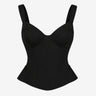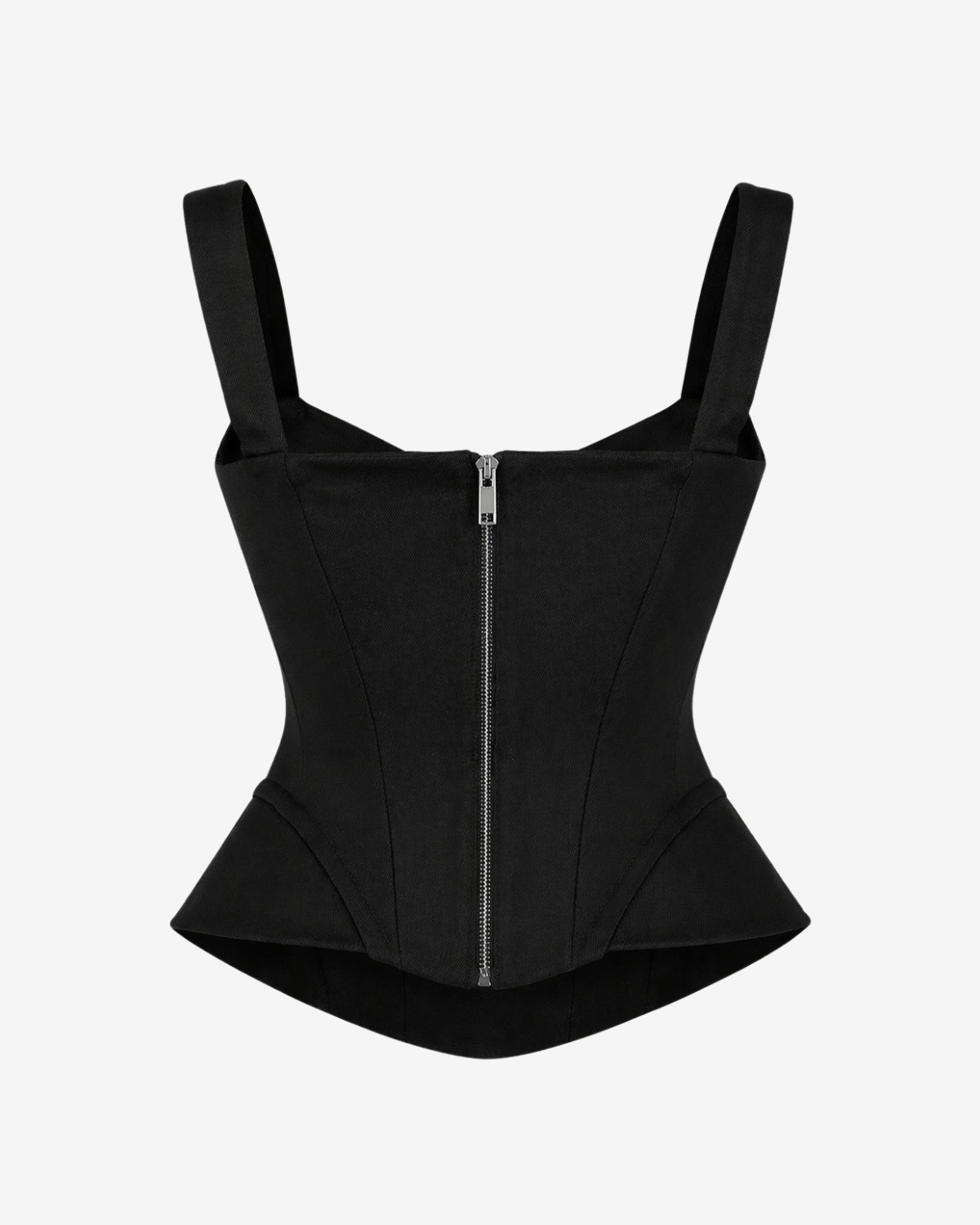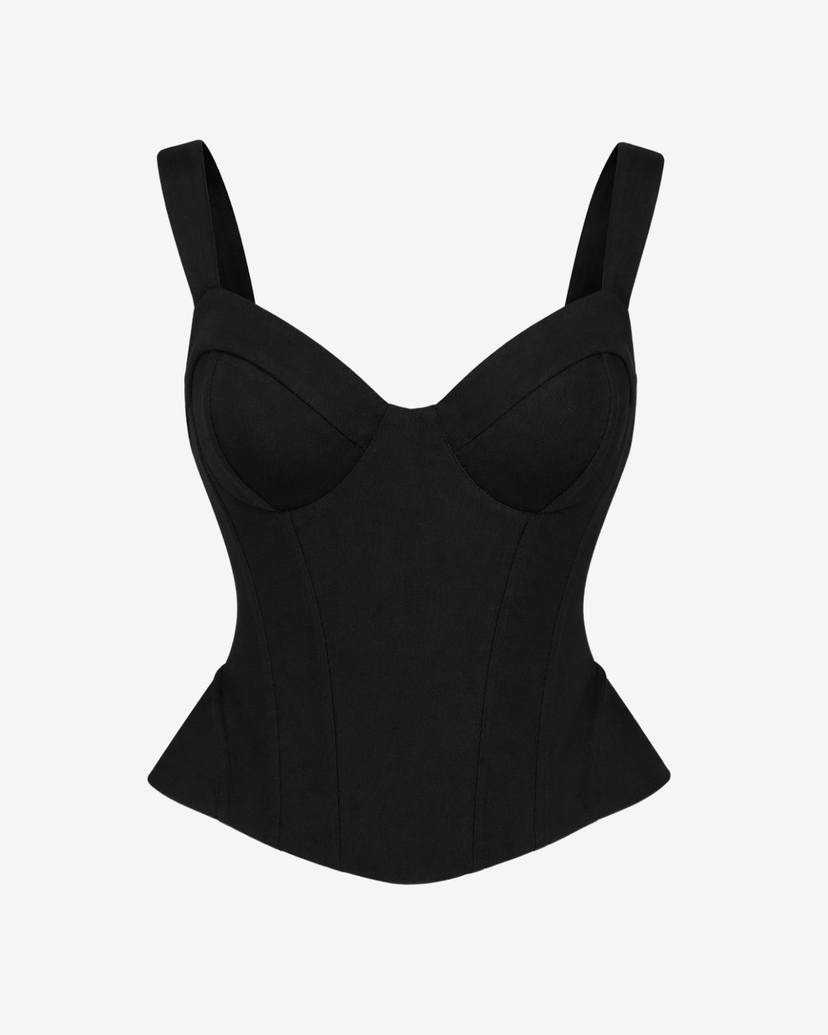 Un top tip corset, conceput cu cupe structurate si linii de croi care evidentiaza silueta. Prezinta talie subtiata si bretele late pentru echilibru si confort. O piesa ce imbina feminitatea cu o nota arhitecturala indrazneata. Poate fi purtat cu pantaloni scurti cu talie inalta sau o fusta mini pentru un look modern si expresiv.