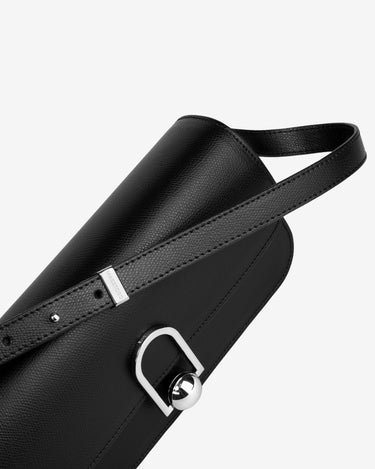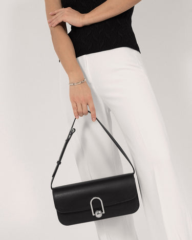 Geanta Baguette EON cu detalii argintii, neagra, este un accesoriu elegant si versatil, ideal pentru orice garderoba. Cu o silueta alungita si un design structurat, aceasta geanta impresioneaza prin inchizatoarea cu estetica arhitecturala si detaliile argintii rafinate. Bareta reglabila permite purtarea pe umar, iar prin detasarea acesteia, geanta poate fi transformata intr-un clutch sofisticat.