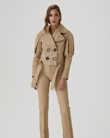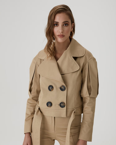 Jacheta Statement cu Revere Largi, Bej, este o piesa vestimentara indrazneata si feminina, cu revere largi ce adauga un aer sofisticat. Detaliile artistice sunt accentuate de jocul de lumina si umbra in nuanta discreta de bej. Aceasta jacheta scurta este perfecta pentru a completa o tinuta eleganta.