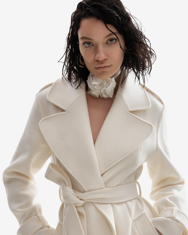 Palton din Lana si Casmir, Alb este o piesa care defineste eleganta discreta si luxul autentic. Confectionat dintr-un amestec fin de lana si casmir, surprinde prin textura moale si aspectul impecabil. Reverele late si detaliile inspirate din estetica vintage, precum mansetele cu catarama si epoletii, adauga caracter si rafinament. Poate fi purtat lejer sau strans in talie cu cordon pentru o silueta feminina si structurata.
