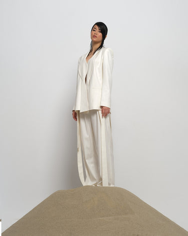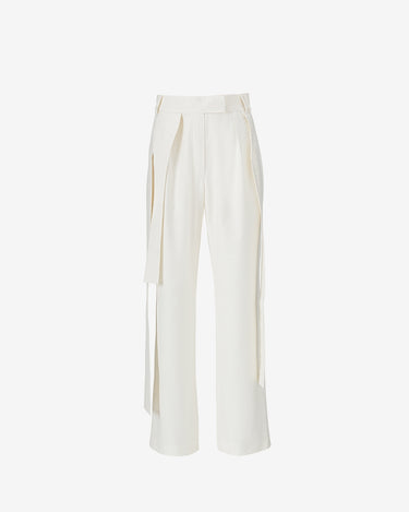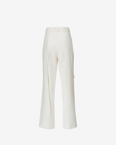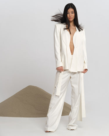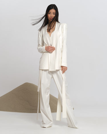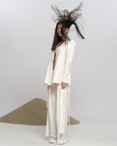 Pantalonii cu papioane albi sunt piesa vestimentara ce atrage atentia prin designul lor unic. Talia inalta si lipsa buzunarelor ofera o silueta eleganta, in timp ce papioanele supradimensionate si asimetrice adauga un element de dramatism. Inchiderea frontala cu fermoar si nasturi imbracati completeaza aspectul sofisticat al acestor pantaloni.