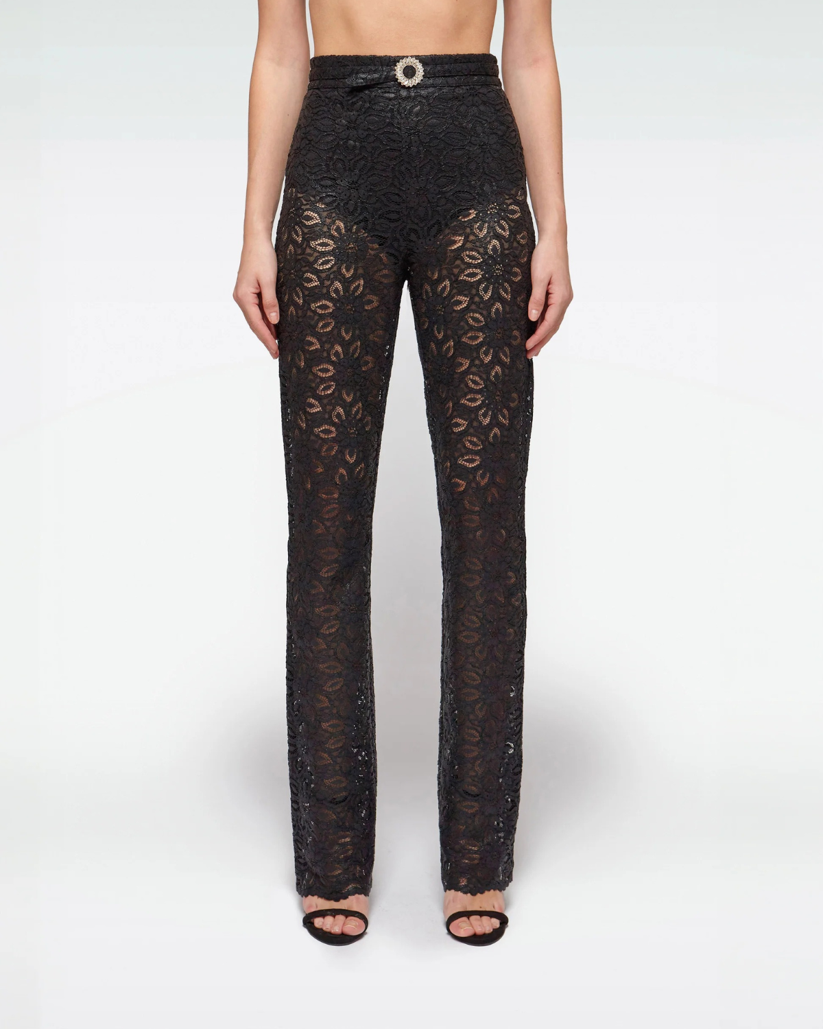 Pantalonii din dantela Carolyn, negri, sunt o piesa sofisticata ce imbina eleganta clasica cu detalii pretioase. Realizati din dantela macram fina, au talie inalta si croiala tip tigareta, completata de o curea eleganta cu catarama bijuterie. Captuseala subtire si fermoarul invizibil asigura un confort rafinat si o tinuta impecabila.