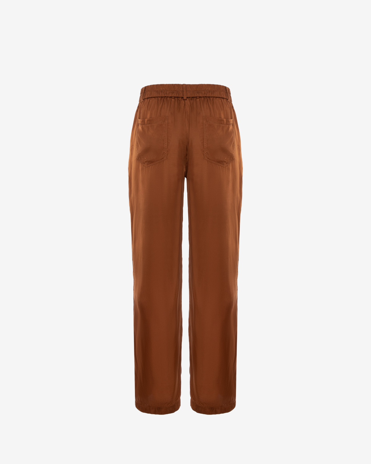 Pantalonii Kooper, maro, sunt definitia elegantei moderne cu un twist alchimic. Confectionati din vascoza fluida, au o croiala lejera, cu picior larg si un finisaj lucios care prinde lumina la fiecare miscare. Nuanța metalica calda evoca forta si rafinament, transformandu-i intr-o piesa versatila si sofisticata.