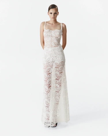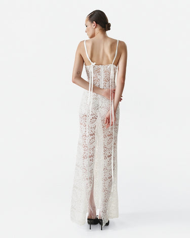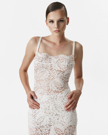 Rochia din dantela cu flori alba este o piesa vestimentara eleganta si seducatoare, ideala pentru ocazii speciale. Dantela brodata cu model floral, de culoare neagra, confera un aer rafinat, iar croiala mulata pe corp accentueaza silueta. Bustul balconet si bretelele din satin, care se leaga, adauga un plus de feminitate, in timp ce deschizatura inalta la spate si inchiderea cu fermoar completeaza designul sofisticat.