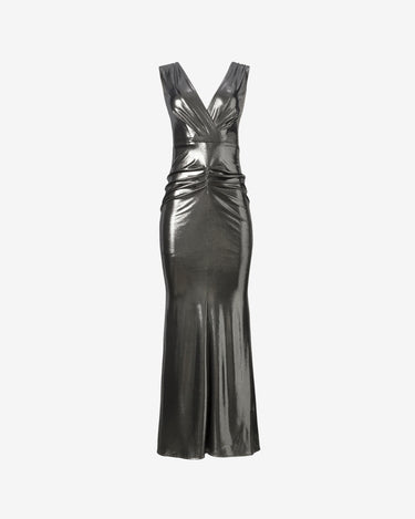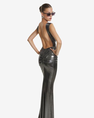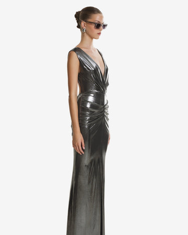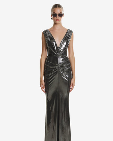 - Stil: Rochie lunga, plisata, drapata, metalica