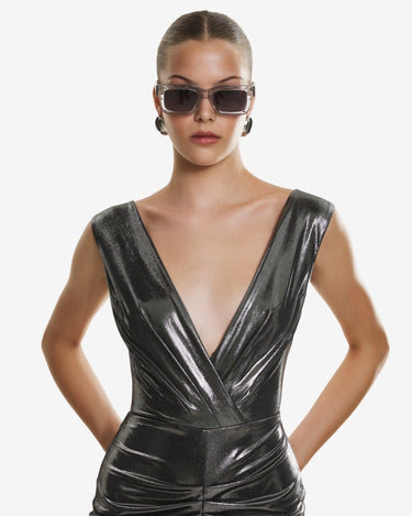 Rochia Lunga "All Eyes on You", Metalica, te va face sa stralucesti la orice petrecere. Designul plisat si drapat iti pune in evidenta silueta, iar materialul metalic adauga un luciu luxos. Inspirata din anii '90, rochia are un decolteu halter, un decolteu adanc si spatele decupat, pentru un efect dramatic. Fusta maxi fluida imbratiseaza corpul si atinge podeaua.