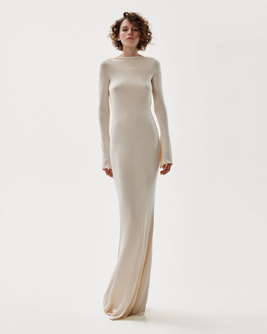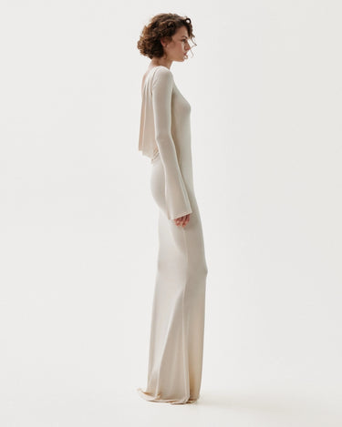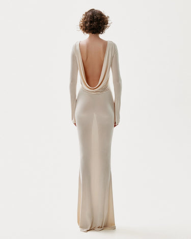 Rochie Maxi cu Spatele Deschis si Drapat, Alb Laptos