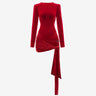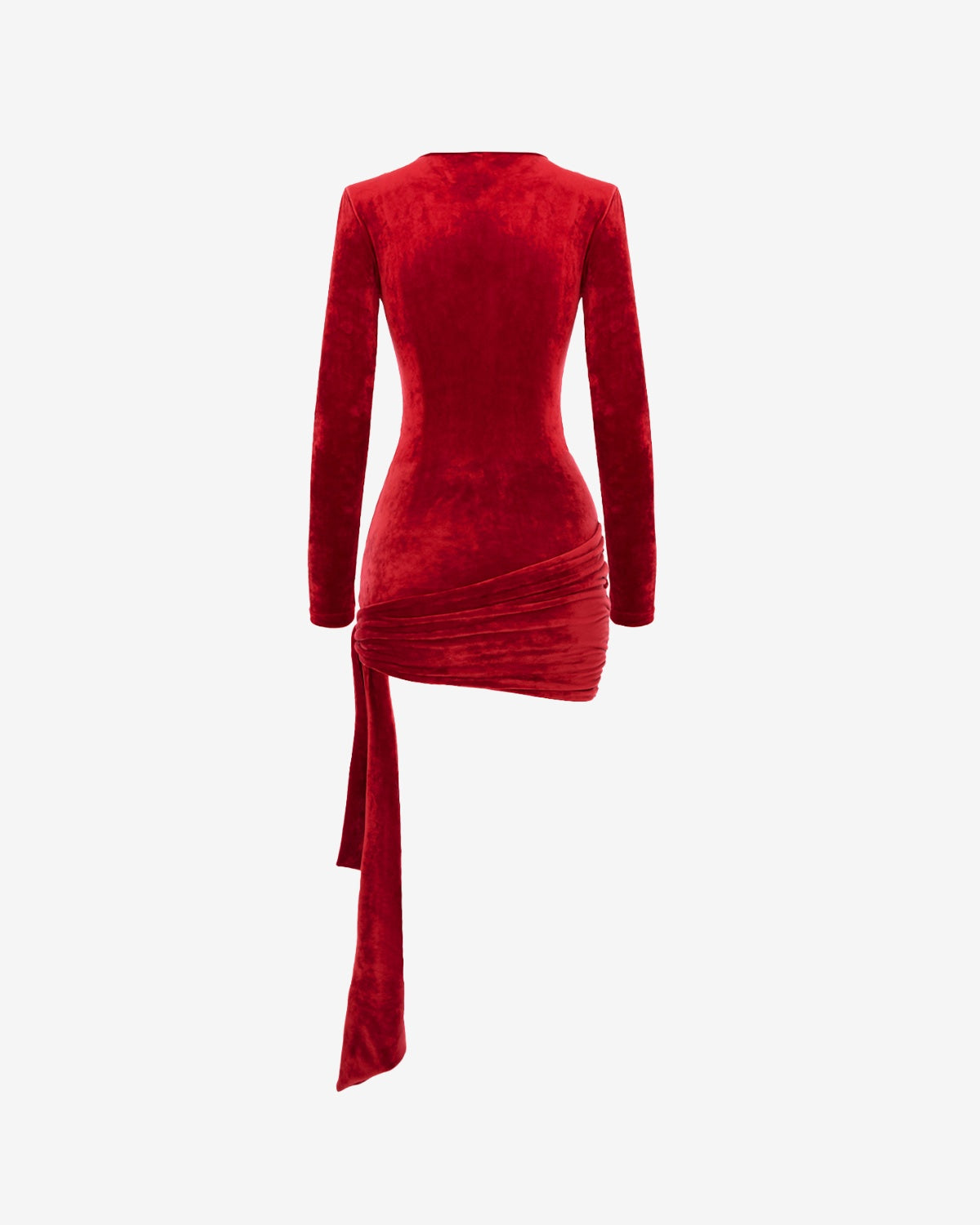 Rochia Velvet Rose rosie din catifea imbina eleganta atemporala cu un farmec modern. Confectionata din catifea moale si elastica, prezinta un guler inalt, umeri bine definiti si maneci lungi pentru o silueta sofisticata. Drapajul asimetric de-a lungul soldurilor adauga rafinament, iar accesoriul RF in nuanta gun-metal completeaza look-ul feminin.