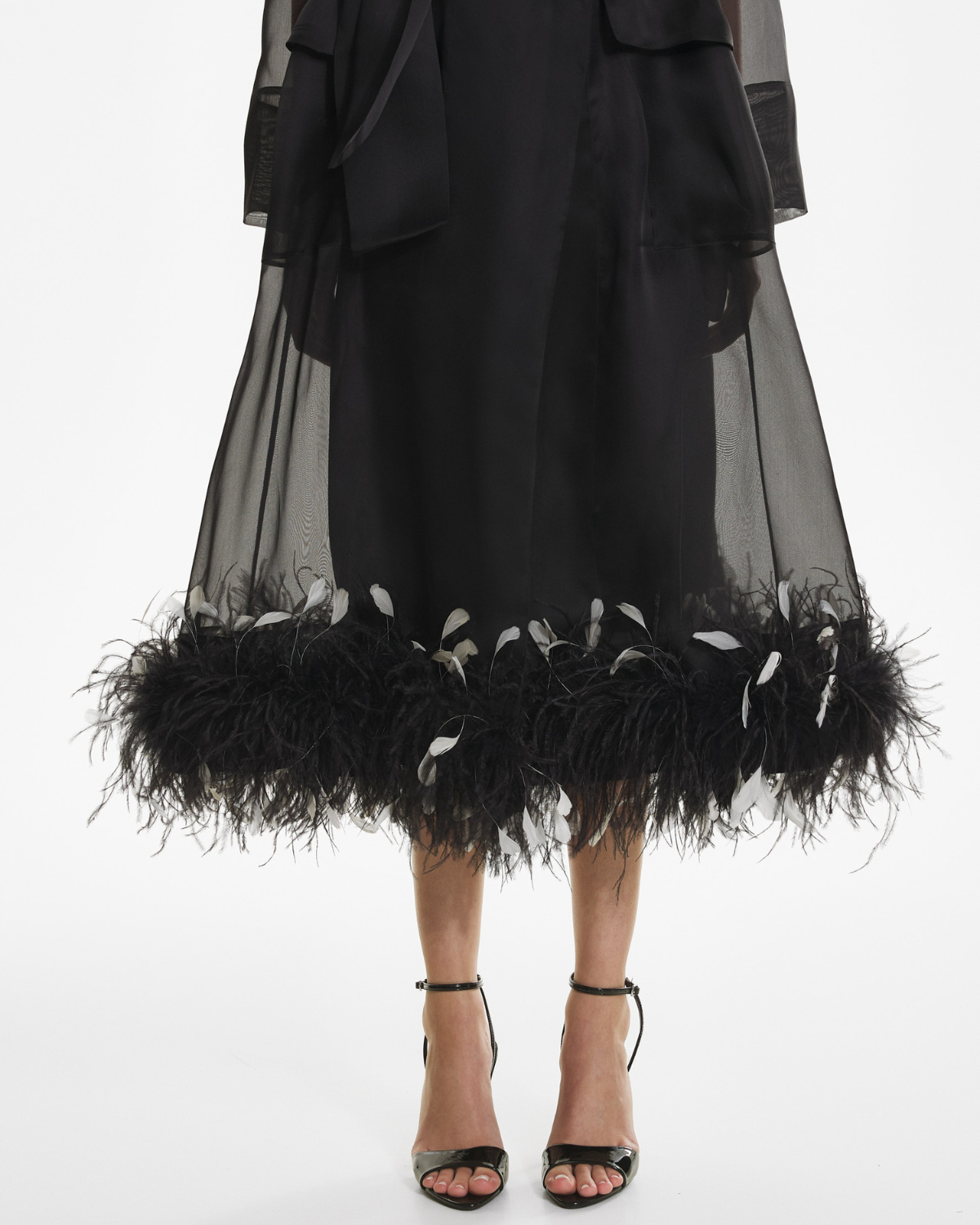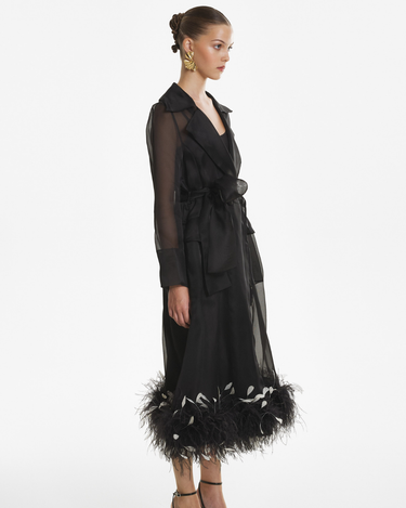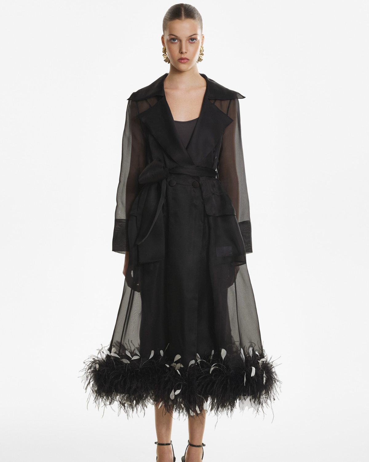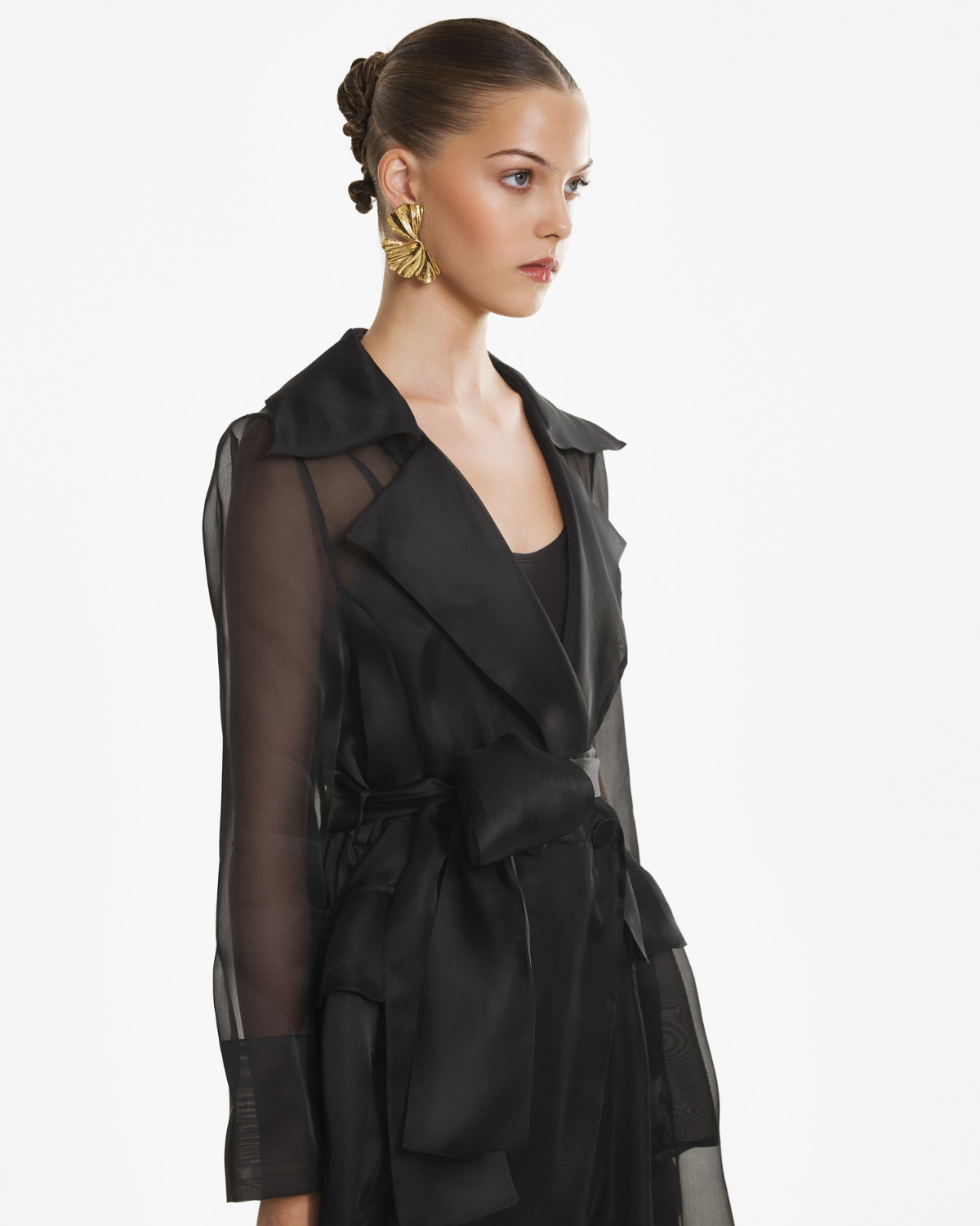 Trench Transparent din Organza, Negru este reinterpretarea sofisticata a clasicului trench, transformata intr-o piesa statement moderna si senzuala. Confectionat din organza fina, cu luciu discret si miscare fluida, acest trench are rever amplu, sistem double-breasted, buzunare aplicate si cordon in talie pentru un plus de feminitate si structurare. Lungimea pana la gambe ii ofera eleganta si rafinament, indiferent de tinuta.