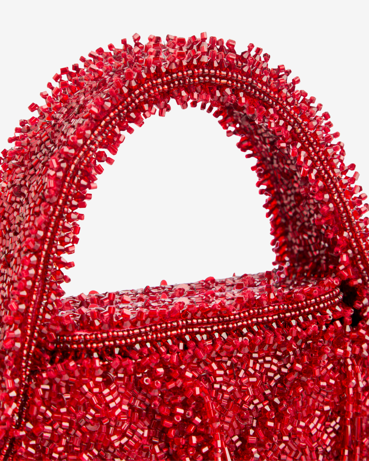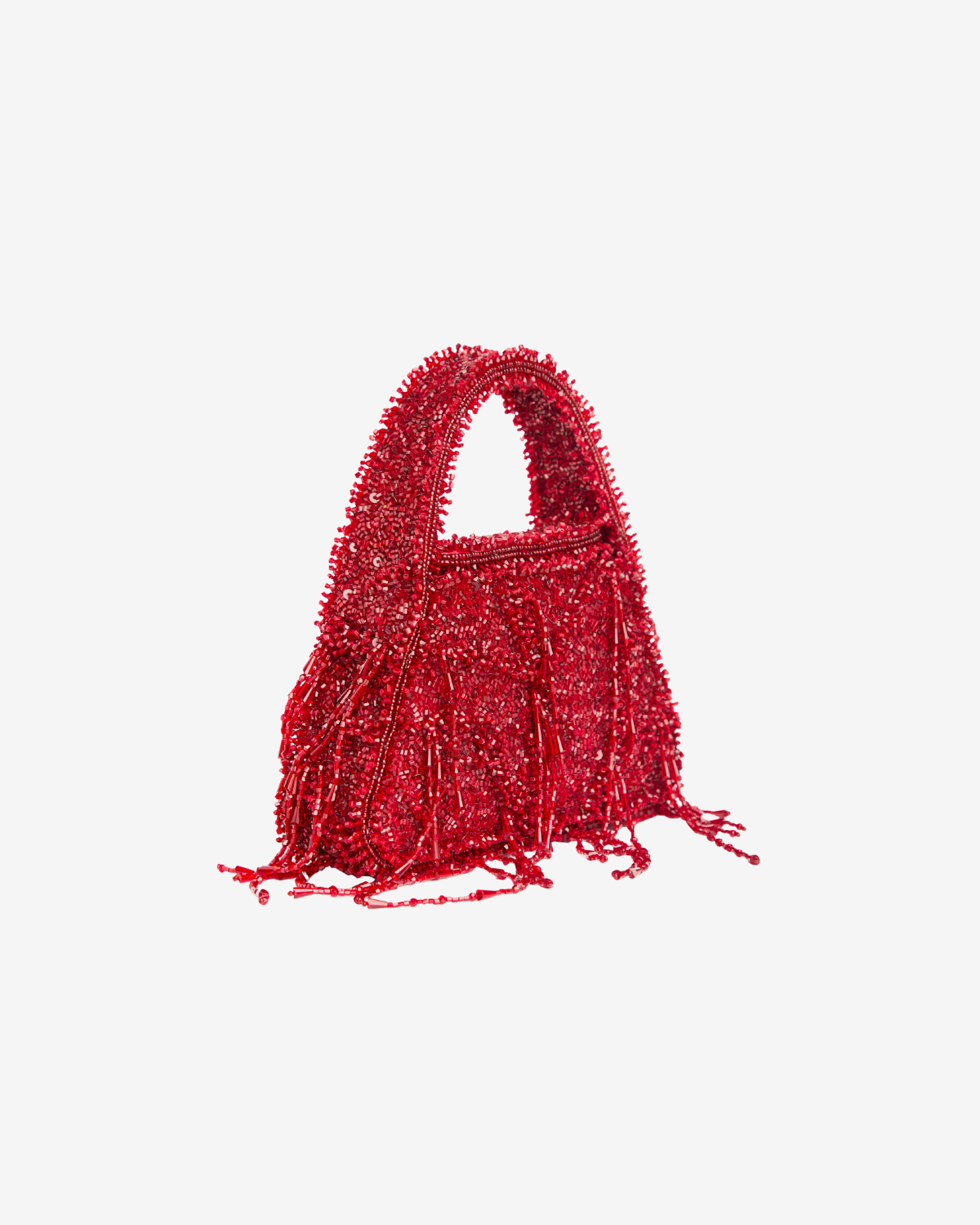 Geanta Ruby este o geanta statement cu silueta mini, decorata integral manual cu sute de margele rosii vibrante, aplicate una cate una de artizani. Textura bogata si luciul subtil al margelelor creeaza un efect spectaculos la fiecare miscare, in timp ce franjurile fluide adauga un aer couture si un plus de dinamism. Manerul superior brodat completeaza designul structurat, pastrand un echilibru elegant intre forta vizuala si delicatete.
