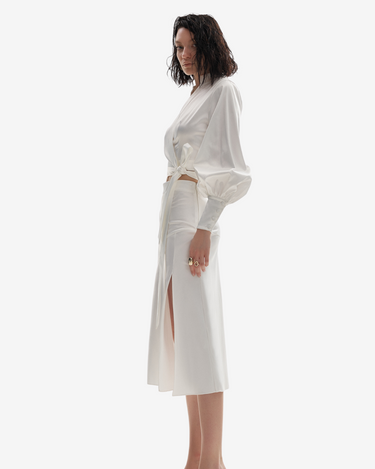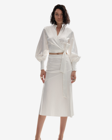 Camasa petrecuta cu maneci bufante alba este o piesa vestimentara scurta, cu maneci bufante ce adauga un plus de volum si eleganta. Mansetele cu nasturi din satin completeaza aspectul sofisticat, iar banda elastica de la spate asigura un confort sporit. Legarea laterala ofera o nota distinctiva.
