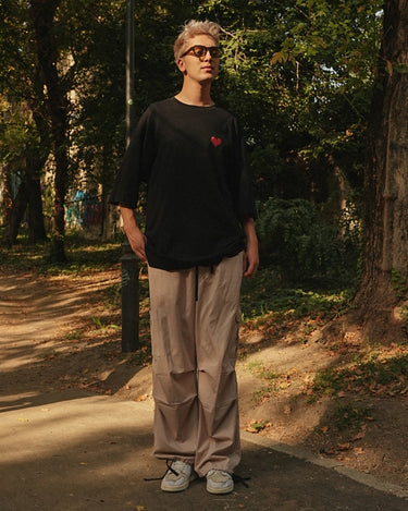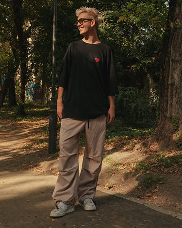 Pantaloni cargo largi cu buzunare, bej, sunt o piesa vestimentara confortabila si practica, inspirata din stilul cargo clasic. Designul larg si multiplele buzunare ofera functionalitate si un aspect modern. Confectionati din bumbac organic, acesti pantaloni sunt confortabili si usor de purtat, fiind ideali pentru diverse activitati. Elementul special al acestor pantaloni este inspiratia cargo, combinata cu confortul bumbacului organic si al designului larg.