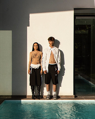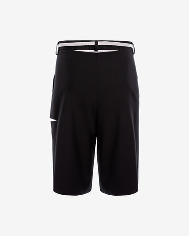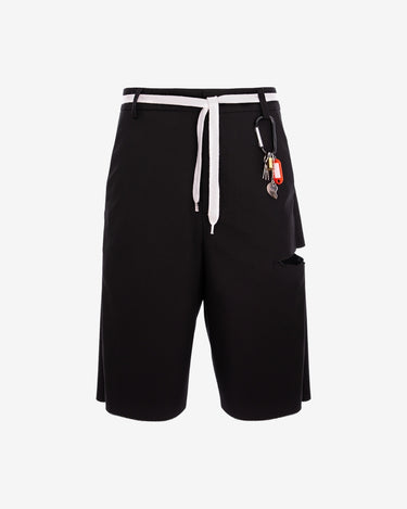 Pantaloni scurti din stofa, negri, sunt o piesa vestimentara indrazneata, perfecta pentru a-ti exprima stilul unic. Designul lor include rupturi moderne si buzunare practice, iar fermoarul acoperit asigura un aspect elegant. Accesoriile inedite, precum chei, lacat, inima franta si siret de pantofi, adauga un plus de originalitate.