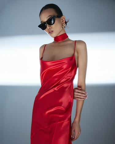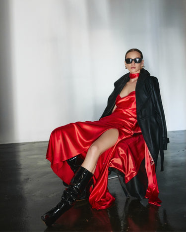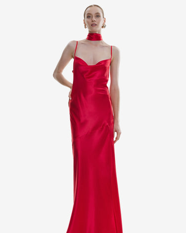 Rochia Lunga din Matase, Rosie, este o piesa vestimentara ce emana eleganta atemporala. Cu un guler drapaj gratios si o fanta indrazneata, aceasta rochie accentueaza contururile naturale, oferind o prezenta puternica si feminina, perfecta pentru evenimente festive. Matasea sculptata si spatele meticulos realizat completeaza aceasta creatie sofisticata.