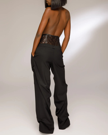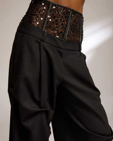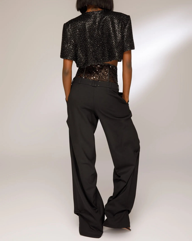 Pantalonii cu pense si detalii stralucitoare imbina eleganta clasica cu un accent modern si sofisticat. Croiala conica, cu pense bine definite, alungeste silueta, iar detaliile discrete cu efect stralucitor adauga un plus de rafinament. Ideali pentru evenimente speciale sau tinute de seara cu personalitate.