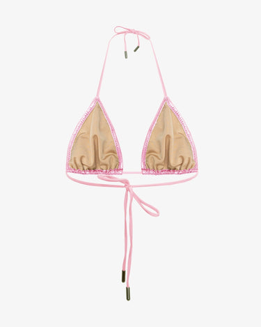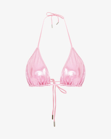 Lumineaza-ti vara cu "Metallic Pink", sutienul de baie triunghi care imbina un design minimalist cu un efect glam metalic. Fabricat dintr-un material cu insertii stralucitoare, acest top atrage lumina si privirile, adaugand un strop de eleganta indrazneata stilului tau estival.