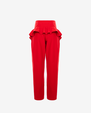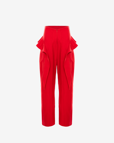 Cu talie in V adanca si o structura tip balloon, acesti pantaloni rosii sculpturali sparg silueta asteptata prin drapaje plasate in zona soldurilor. Inspirati de date corupte si distorsiuni vizuale, insertiile unghiulare evoca ideea unei miscari surprinse in mijlocul unui glitch. Realizati dintr-un denim ferm, dar fluid, pantalonii creeaza o tensiune subtila intre rigiditate si ritm.