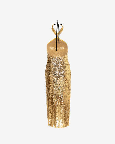 Rochia cu paiete, aurie, este o piesa vestimentara stralucitoare, perfecta pentru evenimente speciale. Aceasta rochie de lungime medie se remarca prin paietele aurii, care ofera un efect vizual spectaculos. Designul include o despicatura pe picior, adaugand o nota de senzualitate, si un spate gol, accentuat de un accesoriu metalic la gat. Croiala pe corp evidentiaza silueta, asigurand un look elegant si feminin.