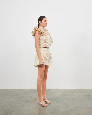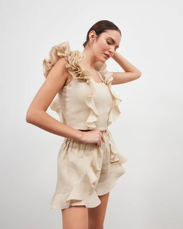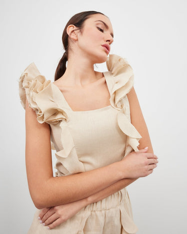 Topul Flirty din in este definitia stilului brandului nostru. Realizat din in luxuriant, cu o structura bogata, accentueaza umerii incretiti cu un aer extravagant si feminin. Creeaza un look seducator, potrivit atat pentru zi, cat si pentru seara, garantat sa atraga toate privirile.