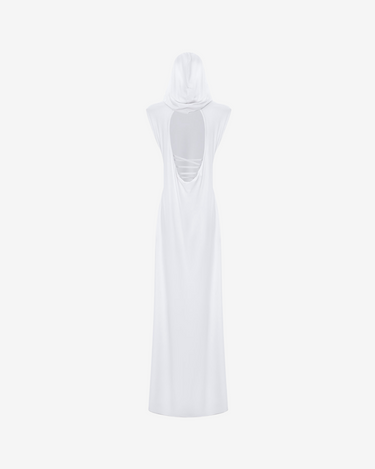 Silueta sculpturala realizata din lycra elastica, rochia Echo Drape imbina fluiditatea cu intentia clara. Proiectata sa urmeze linia corpului ca o a doua piele, tesatura se muleaza si se misca odata cu tine, accentuand formele naturale fara a restrictiona. Gulerul inalt drapat evoca pliuri digitale, adaugand profunzime si dimensiune, in timp ce manecile scurte adauga o structura moderna si puternica. Din fata, exprima retinere si precizie — dar spatele spune o alta poveste: adanc decupata, dezvaluie un contrast puternic intre acoperire si expunere. Curata si minimalista la prima vedere, dar bogata in constructie la o privire mai atenta, aceasta piesa intruchipeaza o complexitate tacuta — acolo unde eleganta atemporala se intalneste cu distorsiunea contemporana.