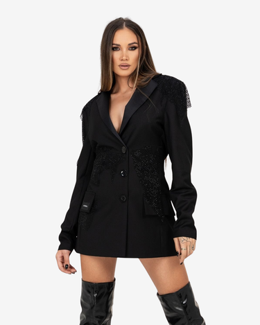 Sacoul Electra, negru, imbina eleganta clasica cu un aer modern si puternic. Croiala masculina este echilibrata prin talia accentuata cu elastic ascuns, iar aplicatiile cu pietre negre adauga o nota glam subtila. Realizat din stofa fina si captusit cu vascoza, este o piesa rafinata si versatila pentru tinute statement.
