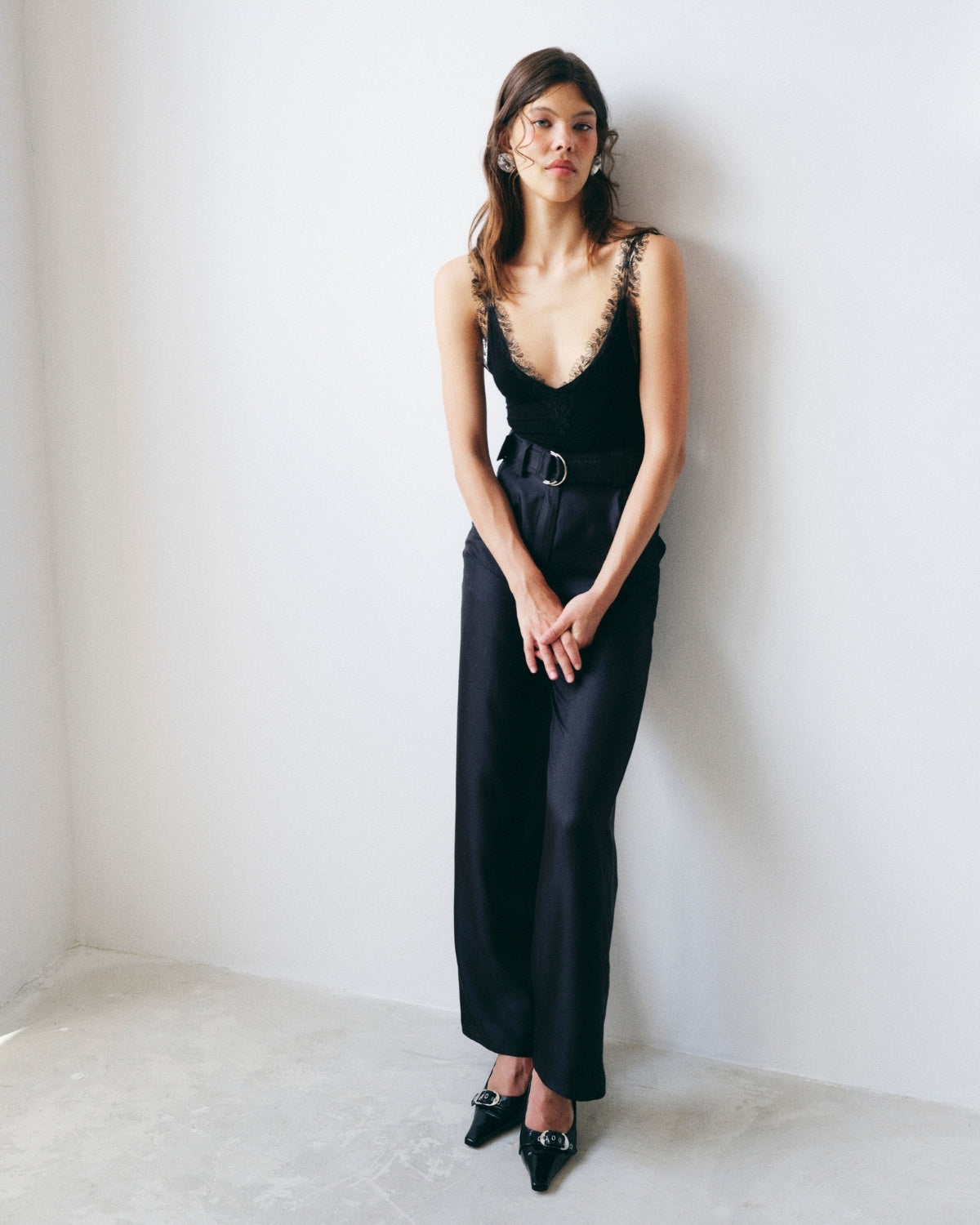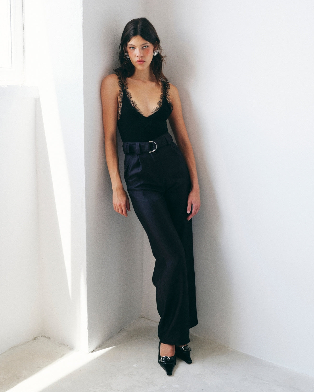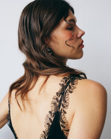Body Isabel, Negru este o piesa eleganta cu silueta sculptata, realizata dintr-un material moale si fluid care urmareste linia corpului. Designul este definit de decolteul drapat manual, care adauga profunzime si rafinament, in timp ce manecile lungi transparente creeaza un contrast delicat intre structura si fluiditate.