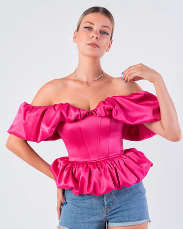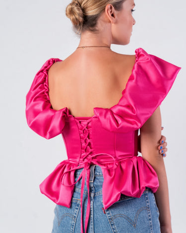 Corset top, fuchsia, este o piesa vestimentara ce imbina perfect feminitatea cu un design contemporan. Confectionat din tafta de inalta calitate, acest corset se remarca prin volanul ondulat din zona decolteului si a taliei, oferind un aspect sofisticat. Inchiderea cu siret la spate permite ajustarea perfecta, accentuand silueta.