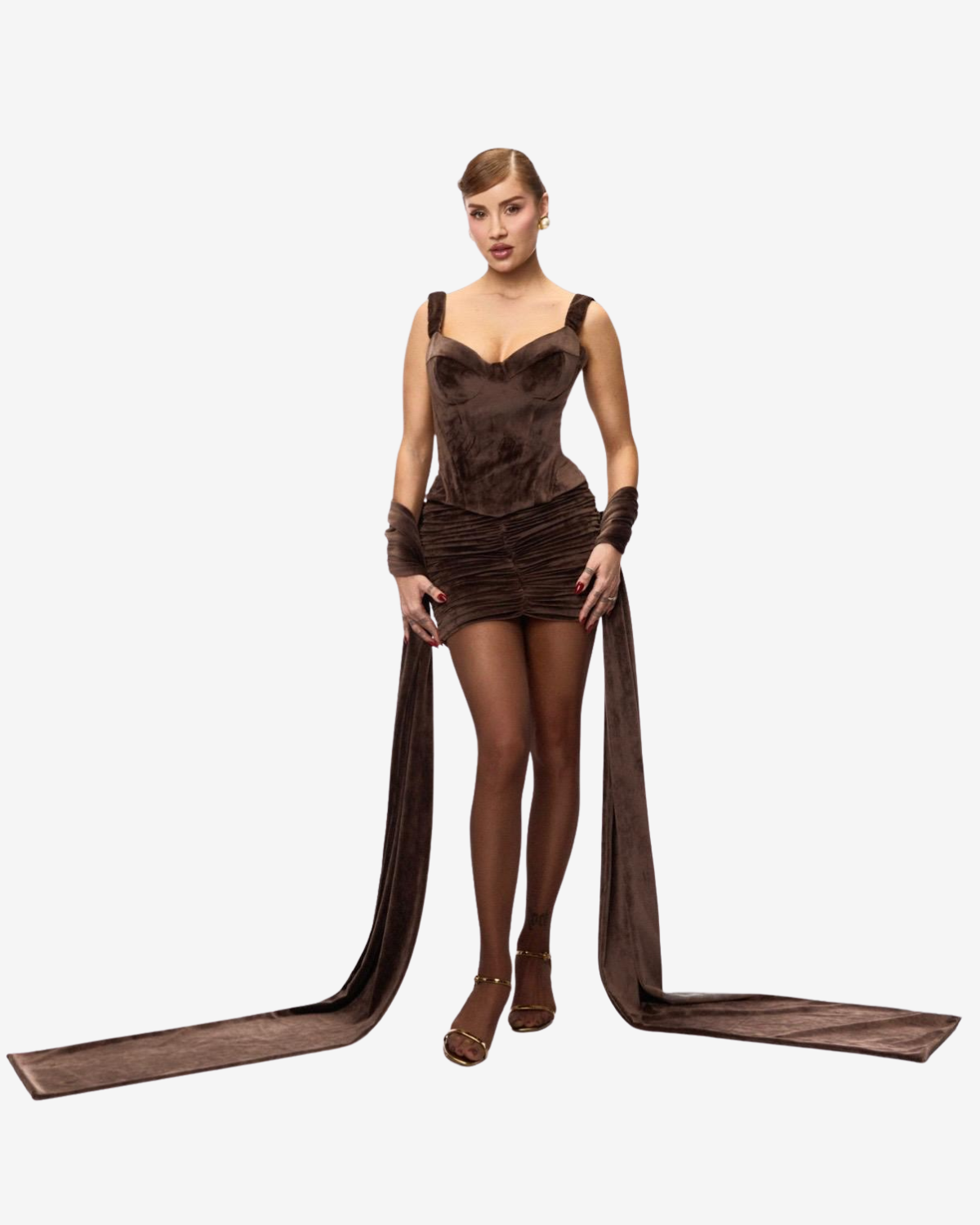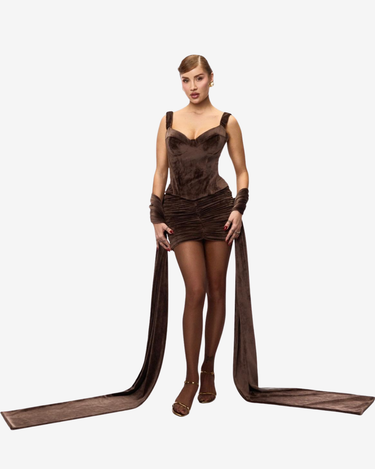 Fusta Mini Cocoon, Chocolate Blankie este o fusta mini realizata din catifea cu textura soft si finisaj elegant, conceputa ca piesa statement in garderoba ta. Drapajul frontal adauga dinamica si volum, in timp ce materialul catifelat pune in valoare profunzimea nuantei de maro ciocolatiu, creand un efect vizual sofisticat si senzual.