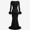 Rochia Luna cu pene, neagra, este o creatie sculpturala semnata Anna Roman, ce imbina minimalismul modern cu detalii couture spectaculoase. Realizata din lycra premium cu elasticitate controlata, se muleaza elegant pe corp, in timp ce penele de strut aplicate manual la maneci si tiv adauga un aer dramatic si sofisticat.
