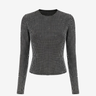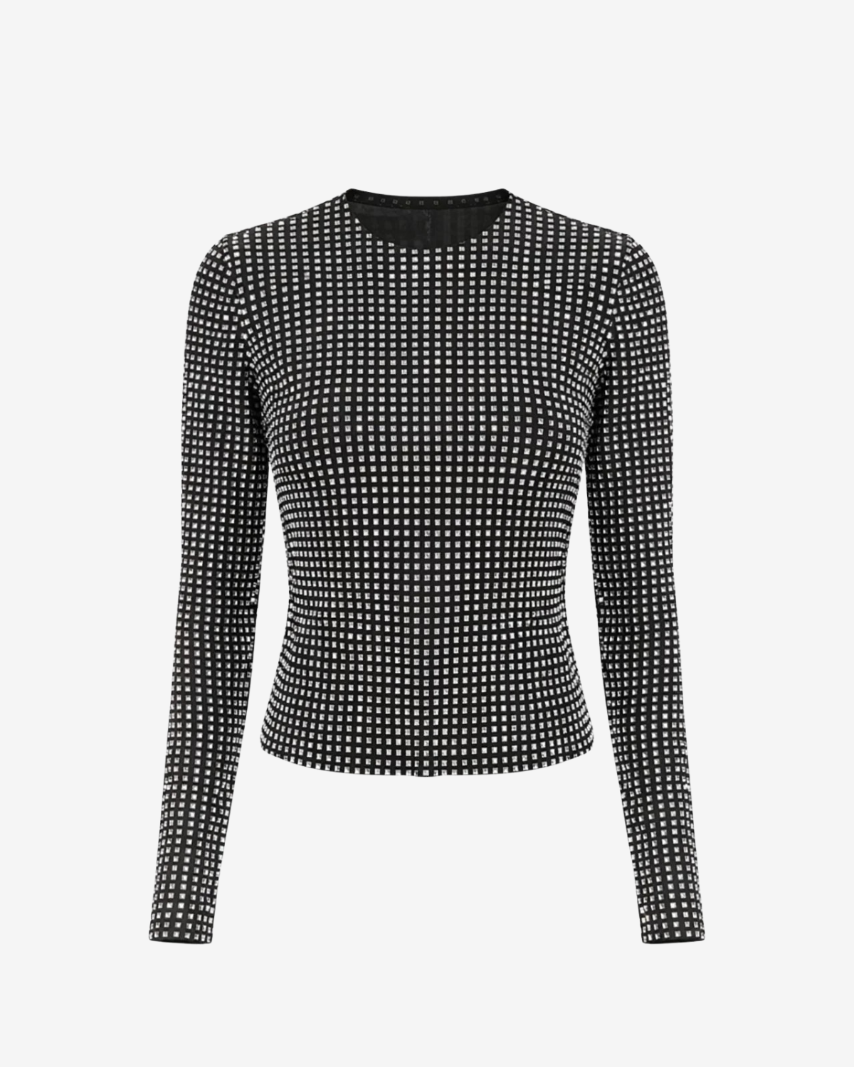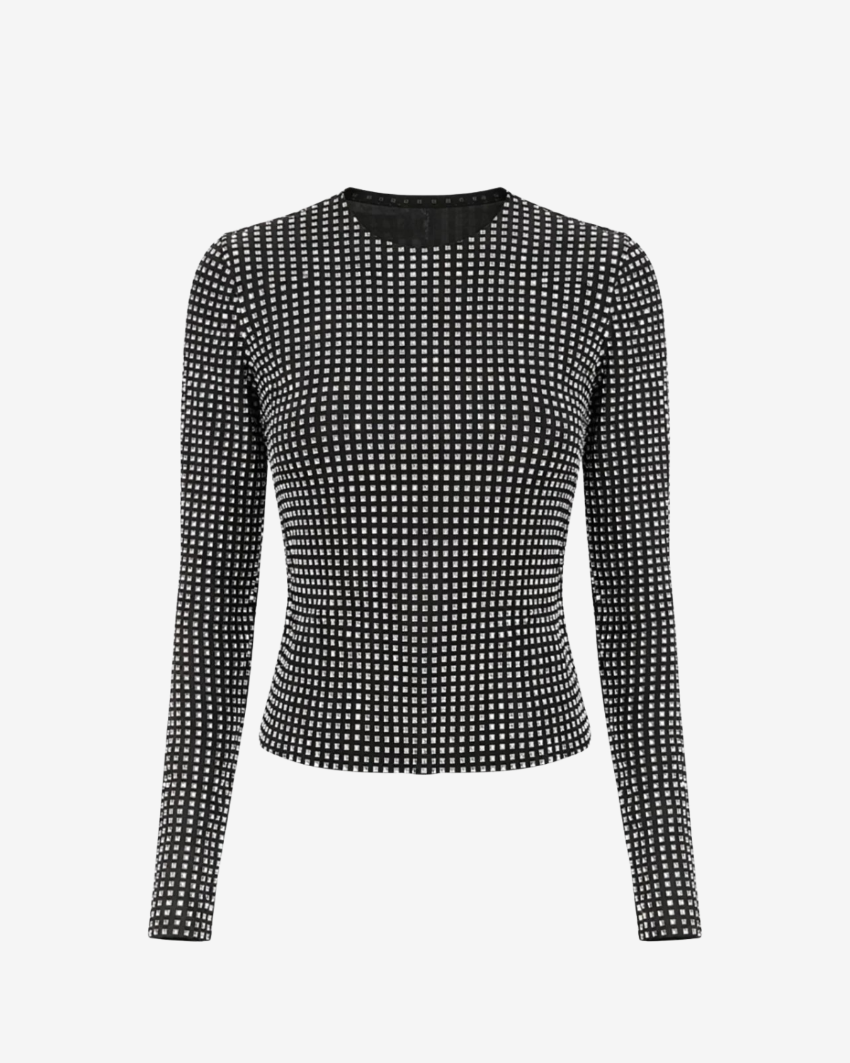 Top Crystal Grid este o piesa statement care atrage atentia prin textura spectaculoasa si efectul vizual puternic. Realizat dintr-un material elastic acoperit integral cu cristale dispuse in pattern grid, topul urmareste linia corpului si reflecta lumina la fiecare miscare. Silueta este curata, cu guler rotund si maneci lungi, lasand textura sa devina elementul central.